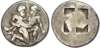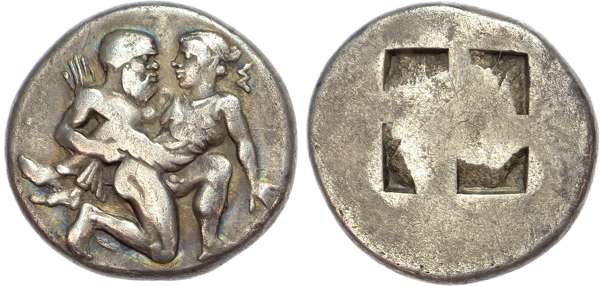 Nude ithyphallic satyr right, carrying nymph who raises her hand in protest, Σ behind. Rev. Quadripartite incuse square. (Svoronos pl. 99, 23; HGC 6, 331; Dewing 1323). Good Very Fine or better. Early Classical style. Rare variety with ‘Σ’. Pleasing cabinet tone.