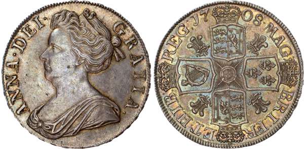 Anne (1702-1714), Crown, 1708, SEPTIMO, plumes, second bust left, reverse crowned cruciform shields, plumes in angles, nine strings to harp, (S.3602, Bull 1347, ESC108). Choice extremely fine, some parts better. Delightful orange, blue toning, with underlying brilliance.