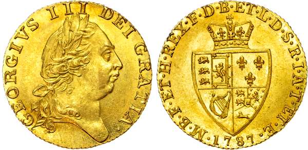 George III (1760-1820) 'Spade' Guinea, 1787. Fifth laureate head right. Rev, crowned 'spade' shield, seven strings to Irish harp, date below (S. 3729; EGC 711; MCE 391). Extremely fine with brilliance.