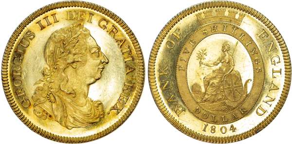 George III (1760-1820) Gilt Silver Proof Bank of England Dollar, 1804. Soho mint, Birmingham, 1804. Laureate and draped bust right. Rev. Britannia seated left, holding branch and spear, resting on shield bearing the Union flag, 27.4g (Bull 1947; ‘R5’ ESC 160A; L&S -. ). About as struck with some contact marks. An impressive example.