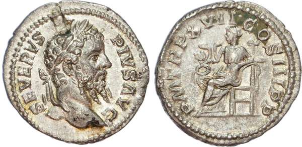 SEVERVS PIVS AVG, laureate head of Severus right. Rev. PM TR P XVIII COS III P P, Salus seated left, holding snake. (RIC 230). Good Very Fine. Flan flaw to obverse.