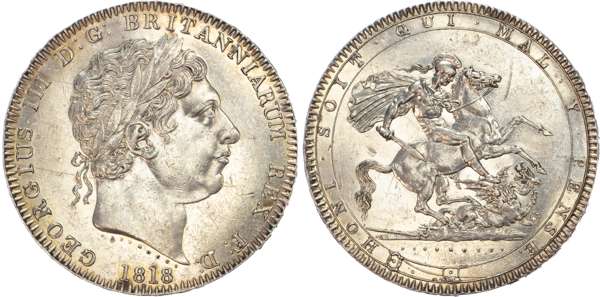 George III (1760-1820), Crown, 1818 LIX, laureate bust right, rev. St George and Dragon within Garter, (ESC 214; Bull 2009; S.3787). Good extremely fine, lustrous with some scratches both sides