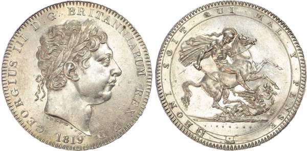 George III (1760-1820), Crown, 1819 LIX, laureate bust right, rev. St George and Dragon within Garter, ( Bull 2010; ESC 215; S.3787). About uncirculated with underlying mint brilliance. Some minor marks.