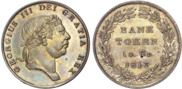 George III (1760-1820), Bank of England, Eighteen Pence, 1813, laureate head right, rev. BANK TOKEN 1S. 6D. 1813 in wreath, plain edge, (Bull 2119; ESC 976; S.3772). Choice almost uncirculated, attractively toned.