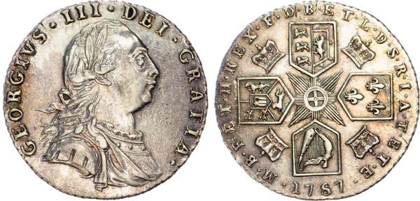 George III (1760-1820), Sixpence, 1787, young laureate, draped and cuirassed bust right, stop above head, rev. four crowned shields cruciform, with hearts, six strings to harp, (ESC 1626; Bull 2187; S.3748). Extremely fine, light purple tone.