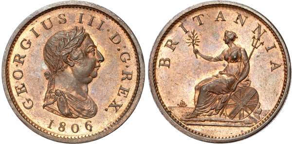 George III (1760-1820), Penny, 1806, small laureate and draped bust right, no incuse hair curl at neck, K. on drapery, date below, beaded border both sides, legend GEORGIUS III.D:G.REX., rev inverted die axis, Britannia seated left on rock with shield, holding trident and olive branch, ship to left, SOHO and K on rock to right, date on raised rim below, BRITANNIA above, edge grained in deep groove (BMC 1343 KP38; S 3780). Choice uncirculated with pleasing red lustre on both sides.