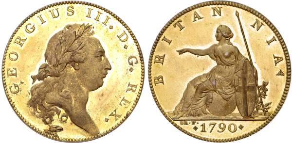 Long haired laureate head right, D. F. on truncation, eagles head and thunderbolt below, GEORGIUS III . D . G . REX ., toothed border both sides. Rev, Britannia seated pointing left on globe, with shield and spear, laurel branch behind, date in exergue between quatrefoils, DR.F. to upper left, BRITANNIA, followed by flower, edge plain (Peck 992, R12). Virtually As Struck, lustrous, very rare.