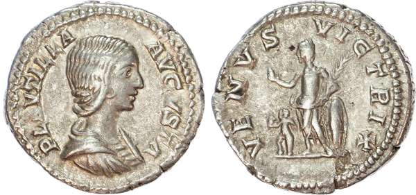 PLAVTILLA AVGVSTA, draped bust of Plautilla right. Rev. VENVS VICTRIX, Venus standing left, holding apple, palm and leaning on shield, cupid to left. (RIC 369; BMC 430). Good Very Fine.