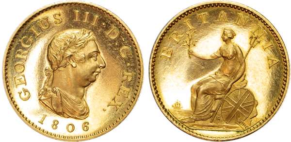 George III (1760-1820), Gilt Copper Proof Farthing, 1806, Soho Mint, early period, laureate and draped bust right, incuse lines, incuse K on truncation, date below, Latin legend and beaded border surrounding, rev. Britannia seated left on rock, holding olive branch and trident with shield, raised K on ground to left of shield, SOHO raised on rock to right, ship sailing right to left of Britannia, edge grained, (BMC 1387; cf. S.3782). As struck with only the slightest of hairlines.
