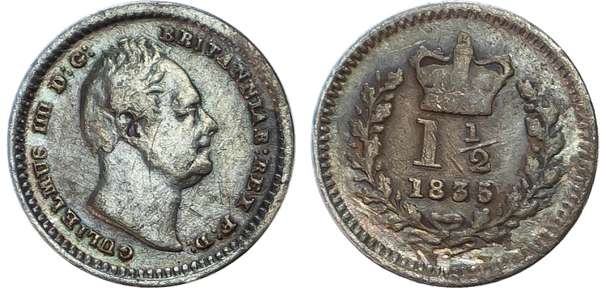William IV (1830-1837) Three-Halfpence, 1835, without over-date.
