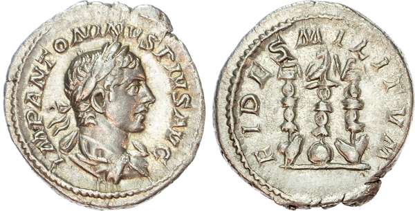 IMP ANTONINVS PIVS AVG, laureate, draped and cuirassed bust of Elagabalus right. Rev. FIDES MILITVM, three military standards. (RIC 78). Extremely Fine.