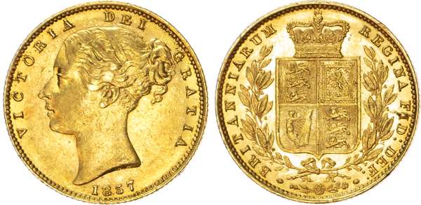 Victoria (1837-1901), Sovereign, 1857, second larger young head left