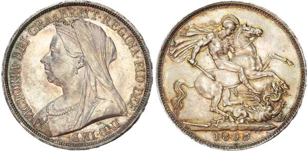 Victoria (1837-1901), Crown, 1893, LVI. Veiled and draped bust left. Rev, St. George slaying the dragon (S. 3937; Bull 2593; ESC 303). Choice almost uncirculated. Attractively toned with underlying mint brilliance.