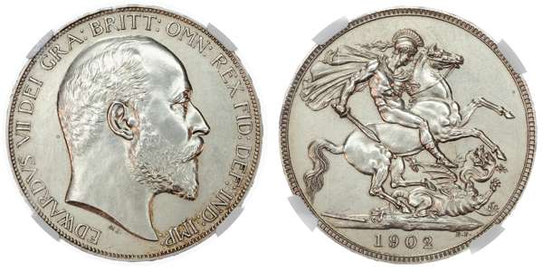 Bare head right DE S below bust truncation, toothed borders both sides, legend surrounds EDWARDVS VII DEI GRA BRITT OMN REX FID DEF IND IMP. Rev, Saint George on horseback to right, holding sword and wearing plumed helmet slaying the dragon right, B.P. below ground line to upper right, date in exergue; edge inscription DECUS ET TUTAMEN ANNO REGNI II (S. 3979; Bull 3562; ESC 362). Much As Struck, in NGC holder graded PF 60 Matte (6674634-001).