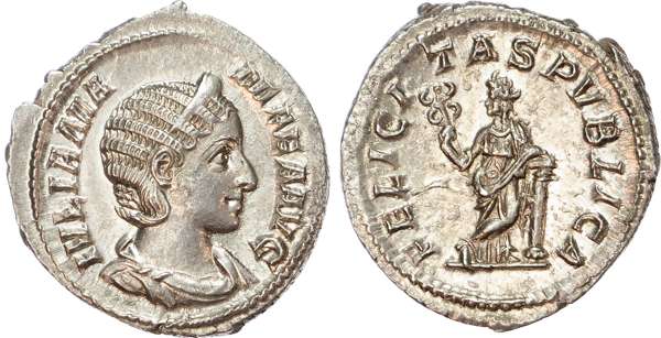 IVLIA MAMAEA AVG, draped bust of Julia Mamaea right. Rev. FELICI-TAS PVBLICA, Felicitas leaning left on column, holding caduceus. (RIC 335; BMC 483). Extremely Fine.