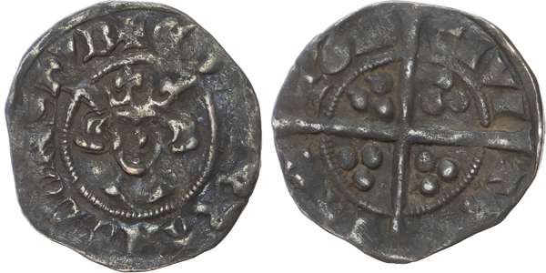 Crowned facing head, +EDWAR R ANGL DNS HYB, rev, Long cross pattée with three pellets in each angle, CIVITAS CANTOR, 1.27gm (N. 1067; S. 1466). Almost Very Fine, toned.