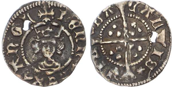 London mint, Annulet Issue (1422-1430), crowned facing head, +HENRIC REX ANGL, rev, Long cross pattée with three pellets in each angle, annulets in two quarters, CIVITAS LONDON, 0.48gm (N. 1434; S. 1848), Calais mint, Rosette-mascle Issue (1430-1431), +HENR REX ANGL, rev, VILLA CALIS, 0.46gm (N. 1454; S. 1871). [2] Both good Fine, second pierced.