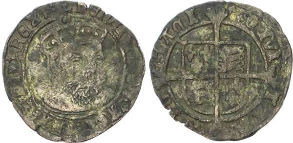 no mm. - York, Struck 1547/51. Crowned bearded second bust of Henry VIII half facing, rev. Long cross fourchée over quartered coat of arms, 2.43gm. (N. 1847; S. 2373). Horribly weakly struck and base – but around Very Fine for issue.
