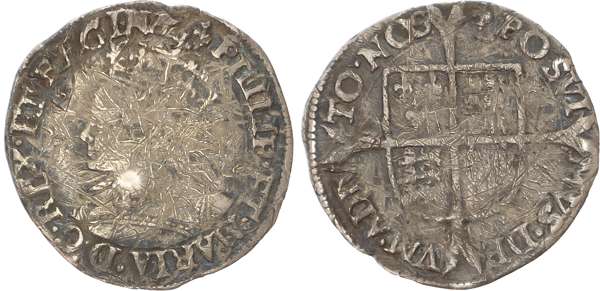 Tower mint, mm lis – 1554-1558, Crowned and draped bust left, PHILIP • ET • MARIA • D : G • REX • ET • REGINA • rev. Square-topped shield over long cross fourchée, POSVIMVS • DEVM • ADIVTO : NOS, 1.83gm. (N 1973; S.2508. Fine, weakly struck and toned.
