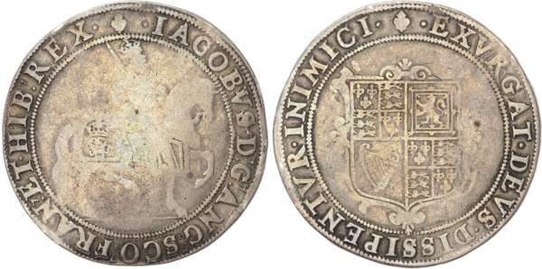 Tower mint, mm: Lis – 1604/05. King on horseback right, crowned rose on caparison, ground-line below, rev. Square-topped and garnished Royal arms, 28.63gm. (N 2070; S 2643), Less than Fine, rev. better.