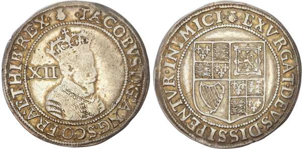 Tower mint, mm: Thistle – 1603/04. First crowned and armoured bust right with square beard, XII behind, rev. Square-topped shield, plain harp, 5.72gm. (N 2072; S 2645). About Very Fine but obv. weakly struck and thus lacking in detail.