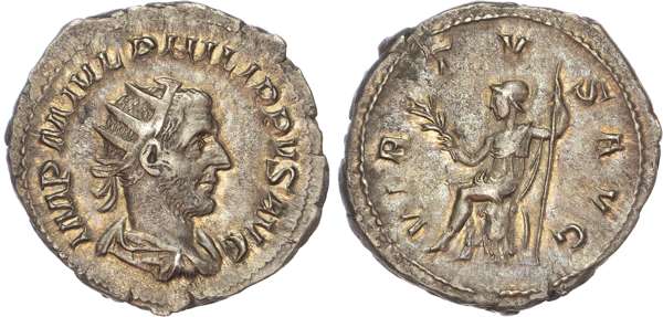 IMP M IVL PHILIPPVS AVG, radiate, draped and cuirassed bust of Philip right. Rev. VIRTVS AVG, Virtus seated left, holding spear and palm. (RIC 53). Extremely Fine. Pleasing cabinet tone.