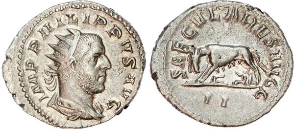 IMP PHILIPPVS AVG, radiate, draped and cuirassed bust of Philip right. Rev. SAECVLARES AVGG, she-wolf left, suckling Romulus and Remus, II in exergue. (RIC 15). Good Extremely Fine.
