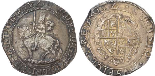 Tower (under King), mm: Triangle – 1641/43. Third Equestrian Portrait of King left, brandishing upright sword, sash flying behind, grassy base line, no caparison., rev. Oval garnished arms, plain harp, 14.86gm. (Brooker 349–51; N 2212; S 2776). Very Fine, toned.