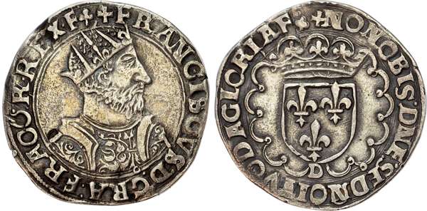 France, Francois I (1515-1547), silver Teston, 12th point, D mintmark on reverse, Lyon, 9.00g (C. 1121; Dy. 904). Good Very Fine, small edge flaw to 11 o’clock. Excellent portrait.