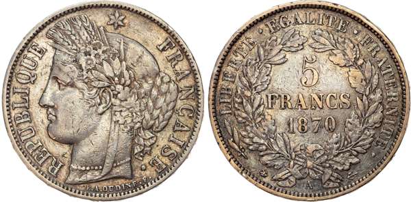 France, Republic, silver 5 Francs, 1870 A, Paris, 24.84g (KM 819). Very Fine.
