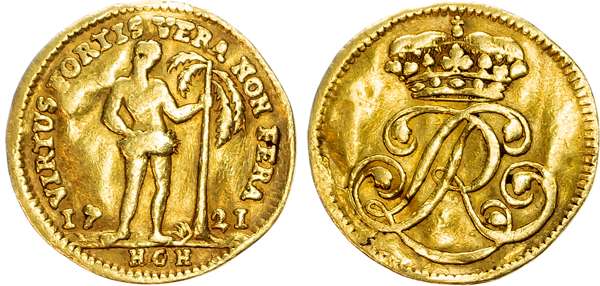 Germany, Brunswick-Luneburg, Ludwig Rudolph (1714-1735), gold Half Ducat, 1721-HCH (Heinrich Christoph Hille), Brunswick mint, 1.71g (Fr. 684; KM 13; Welt. 2444). Good Fine, ex. mount, slightly wavy flan. Very rare.