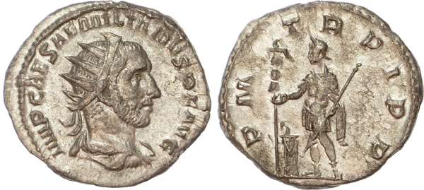 IMP CAES AEMILIANVS P F AVG, radiate, draped and cuirassed bust of Aemilianus right. Rev. PM TR P I P P, emperor standing left, holding standard and sceptre, altar to left. (RIC 7). Extremely Fine for issue. Rare.