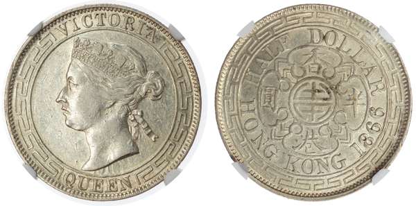 Hong Kong, Victoria (1837-1901), silver Half Dollar, 1866, 13.54g (KM 8; Prid. 4). In NGC holder graded AU 55 (8221733-001). Mintage of only 59,000. Highly sought-after denomination.