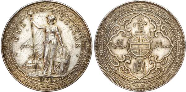 Hong Kong, George V (1910‑1936), silver Trade Dollar, 1930, Bombay mint, struck for circulation in East Asia, Britannia standing facing, head left, holding trident and shield resting on ground; behind, ship in full sail left; all within decorative border. Rev. Chinese symbol flanked by denomination in Chinese characters and Malay script; all within decorative border 26.98g (KM T5). About Extremely Fine. Possibly dipped historically.