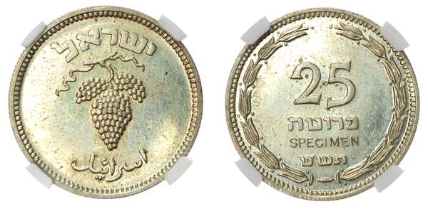 Israel, Republic, copper-nickel Specimen Pattern 25 Pruta, 1949 ICI / JE 5709, Imperial Chemical Industries mint, raised specimen with pearl, 2.75g (KM 12 for business strike). In NGC holder graded SP 64 (8221735-001). Presumed mintage of only 25 pieces.