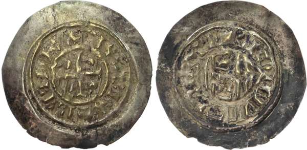 Italy, Berengario I del Friuli (888-915), first period (early 888 – February 889), silver Denaro di stampo largo, Verona mint, cross with pellets in angles, BERNIKARIVS RIX. Rev. Temple, cross in centre, XPIASTANA RI(II)CIO; A’s unbarred on obverse, barred on reverse, normal B, 1.41g, 38mm (MIR (Milano) 14 (RRRR); CNI – , cf. V.31, 39/41, and pl. II, 5; MEC – , cf I.1013, & pp. 249-52). Very Fine for the issue, minor rim cracks, when held to good light a slight rim separation visible in one area, however the coin is intact. Extremely rare.