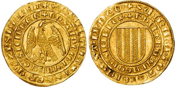 Italy, Sicily, Pietro & Costanza (1282-1285), Pierreale d’Oro, Messina, eagle within two circles of legend. Rev. Arms of Aragon within two circles of legend, 4.37g (F. 654; MEC 756; MIR 170; Spahr pl. 1). Extremely Fine, rare, minor scratch to the obverse at 3 o’clock.