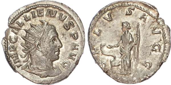 IMP C P LIC GALLIENVS P AVG, radiate, draped and cuirassed bust right. Rev. SALVS AVG, Salus standing left, holding patera and feeding snake which rises from altar, left. (RIC 397). Extremely Fine.