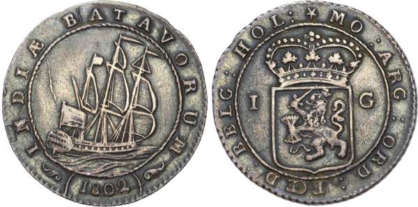 Netherlands East Indies, Batavian Republic, silver Gulden, 1802, Enkhuizen, 10.51g (KM 83; Sch. 448). Good Very Fine, deep toning. An iconic nautical type.