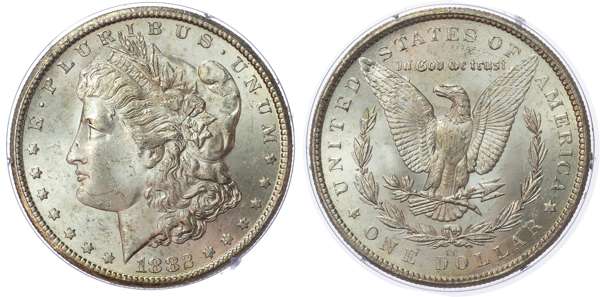 USA, silver Morgan Dollar, 1882, Carson City (KM 110). In PCGS holder graded MS 62 (7226756). Housed in the PCGS old green holder used from February 1986 to September 1989, also known as ‘The Rattler’.