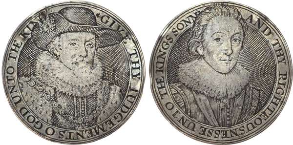 Three-quarter facing draped bust of James, GIVE THY JUDGEMENTS O GOD UNTO THE KING. Rev, three-quarter facing draped bust of the Prince, AND THY RIGHTEOUSNESSE UNTO THE KINGS SONNE (MI I 376/272). Very Fine, ex. mount.
