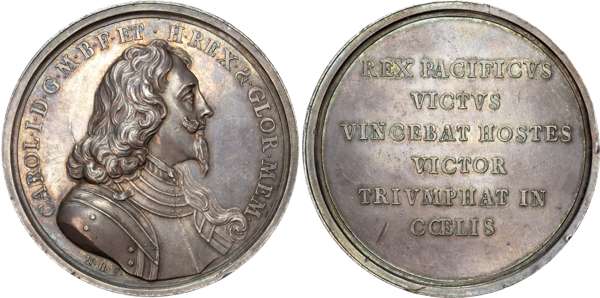 Armoured bust right, CAROL I D G M B F ET H REX & GLOR MEM. Rev, legend in six lines reads REX PACIFICVS VICTVS VINCEBAT HOSTES VICTOR TRIVMPHAT IN COELIS (Eimer 160; MI 346/199; vL II, 320). Small scratch below TRIVMPHAT on rev., otherwise Extremely Fine, die break across bottom of hair and armour, a few edge bumps, attractively toned, very rare.