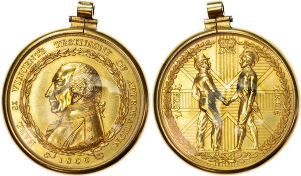 Uniformed bust of Adm. Jervis l., EARL ST VINCENT'S TESTIMONY OF APPROBATION 1800, rev. Naval officer and enlisted sailor shaking hands, with a backdrop of the Union flag, all within an oaken wreath. 47mm/approx. 61.5gm. (BHM 489; Eimer 919). As struck with original lustre, in contemporary, glazed lunettes within a gold (18ct) bezel mount with suspension loop. Housed in a contemporary tooled and fitted box of maroon leather and interior velvet in sound condition. Superb and very rare.