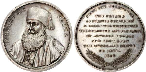 (58mm/70.93gm), 1842, by A.J. Stothard. Three-quarter bust left wearing fez, no signature. Rev, FROM THE COMMITTEE THE FRIEND OF SCIENCE COMMERCE & ORDER WHO PROTECTED THE SUBJECTS AND PROPERTY OF ADVERSE POWERS AND KEPT OPEN THE OVERLAND ROUTE TO INDIA 1840, crossed palm leaves below (Puddester 842.2; Fearon 696; BDM V 696). Extremely Fine, a few light marks, hints of tone to the peripheries. Puddester estimates less than 100 specimens struck in silver, but it is believed that an example in this metal has not appeared on the open market in more than 20 years, which would suggest excessive rarity.