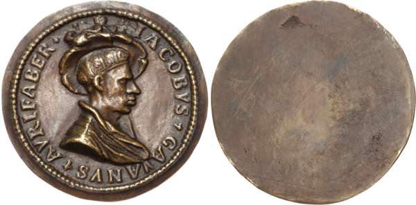 Uniface bronze medallic self-portrait, c. 1523. Bust right wearing large hat, legend reads IACOBUS GAVANVS AVRIFABER. Rev, blank. Later cast, probably mid to late 18th century, Extremely Fine.