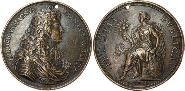 Armoured bust right, hair long, mantle around shoulders. Rev, seated figure of Paris with cornucopae and shield with city arms, this dated, FELICITAS PVBLICA, in exergue, LVTETIA (cf. TN III, XIII, 7). A few trifling marks, pierced, otherwise Near Extremely Fine, probably a late 17th century cast, nicely patinated.