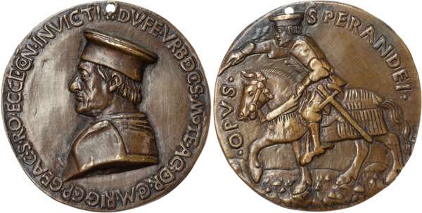 (86mm/201gm) by Sperandio of Mantua (1431-1504). Armoured bust left wearing mortarboard cap, legend reads DVFE VRBDCS MOTE AC DRCM RIGCPGEAC S RO ECCECN INVICTI. Rev, the Duke on horseback riding left pointing with baton, legend reads OPVS SPERANDEI (Hill 389; Pollard 108). Good Very Fine, pierced for suspension, very rare.