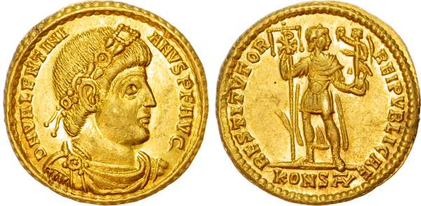 DN VALENTINI-ANVS P F AVG, diademed, draped and cuirassed bust right. Rev. RESTITVTOR REIPVBLICAE, Emperor standing facing, head right, holding Victory and sceptre topped with Christogram, KONSTAV in exergue. (RIC IX 61, 1a.1; Depeyrot 136). Good Extremely Fine. Very Rare (mint of Arles).