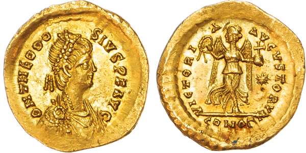 DN THEODO-SIVS P F AVG, diademed, draped and cuirassed bust of Theodosius right. Rev. VICTORI-A AVGVSTORVM, Victory advancing right, head left, holding wreath and globus cruciger, star in right field, CONOB in exergue. (RIC 213). Good Extremely Fine. A gem.