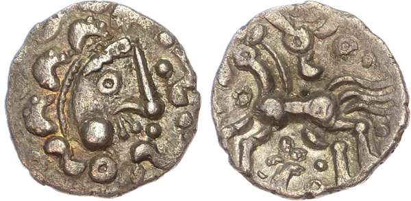 Celticised ‘Moon Head’. Rev. Horse with three tails, ‘eagle’ motif above. (ABC 2012; VA 1020-1). Good Very Fine. A splendid and unusually well-centred example.